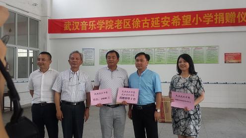 延安希望小学坐落在大别山革命老区徐古街,有423名学生,由于地处大别山实属老少边穷学校。市民进主委彭志敏作了深入调研之后,率音乐学院统战部长程鸿、宣传干事朱长萍、乐器设备科长老洪义、钢琴师徐洪、古陵颖教授等一行六人,向延安希望小学捐献了两台钢琴;民进市委专职副主委万世华向延安希望小学捐献了一批价值5000元的新体育教学器材;武汉市教育局局长孟晖、市财贸学校校长蒋志耕、市民进企业家会员伟华装饰公司董事长赵伟华向延安希望小学捐献了15000元现金。新洲区人大副主任,民进新洲区工委主委刘和金、新洲区徐古街党工委书记程奇才,副主任何志祥、教育总支书记徐新平参加了此次捐赠活动。