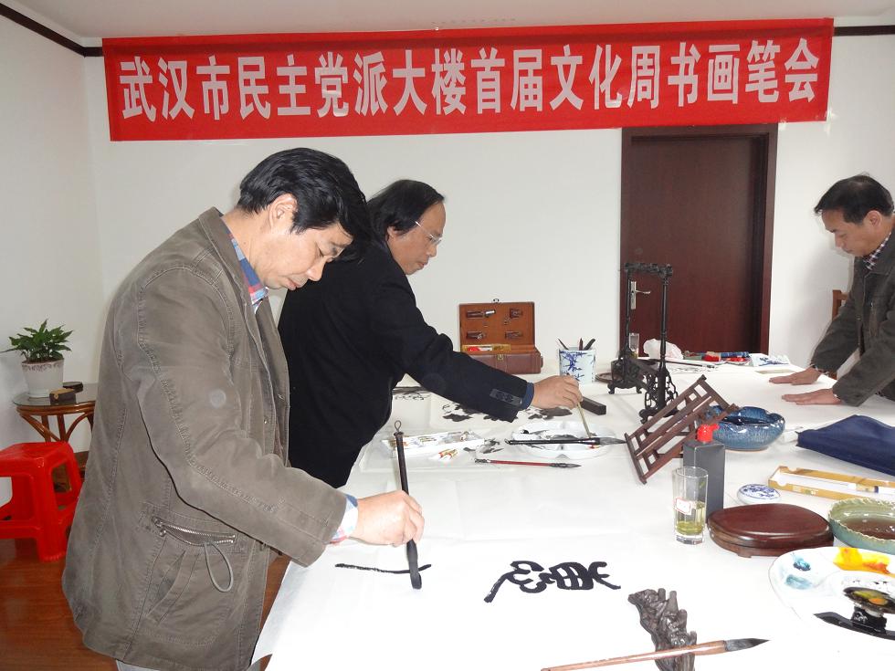 2013年11月26日下午,市委统战部举办的首届民主党派文化周书画笔会活动在市民主党派大楼举行,民进书法家沈邦超、吴象甫、枊鉴祥参加了此次活动。