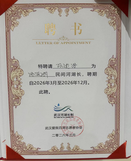 近日,2026年度武昌区民间河湖长选聘工作圆满完成,经资格审查、综合评审、公示聘任等规范程序,民进武汉市委会直属汉口学院支部会员孙迪浩博士,正式当选2026年度民间河湖长。